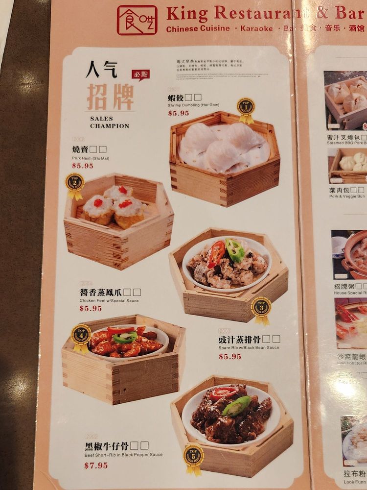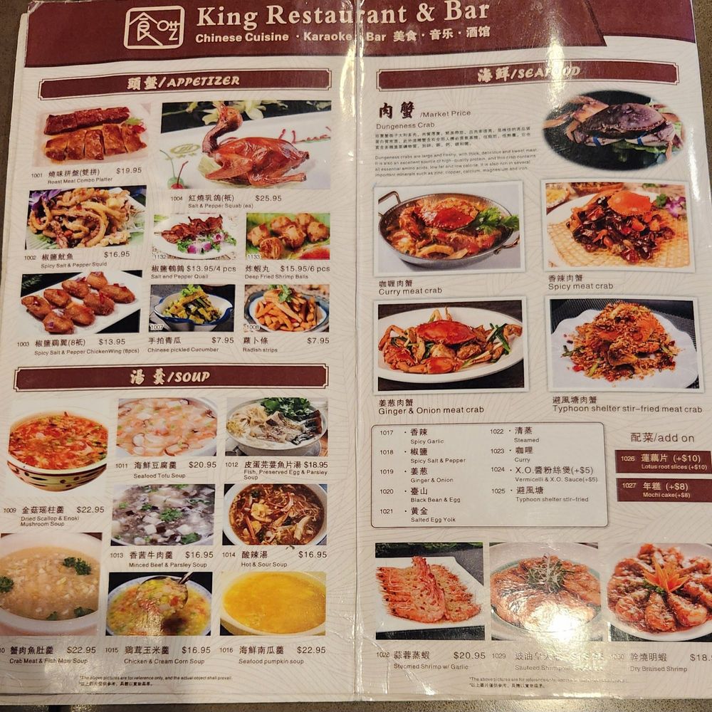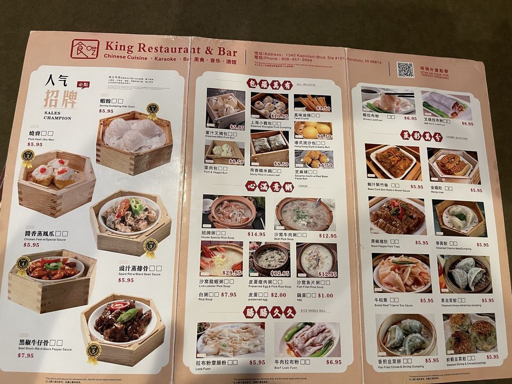 Introducing the menu at King Restaurant & Bar, a delightful spot for Chinese seafood and authentic dishes. Located at 1340 Kapiolani Blvd Ste 101, Honolulu, HI 96814, this restaurant offers a range of options for diners. From succulent Barbecue Pork and Barbecue Spare Ribs to flavorful Soups like Chicken & Cream Corn Soup and Dried Scallop & Enoki Mushroom Soup, there is something for every palate. Appetizers like the Roast Meat Combo Platter and Spicy Salt & Pepper Chicken Wing are sure to please. The restaurant also provides dim sum offerings, including pork hash, shrimp dumplings, and BBQ pork buns. The service is friendly, the atmosphere is welcoming, and the dishes are consistently delicious. Don't miss the opportunity to try the amazing dishes at King Restaurant & Bar for a memorable dining experience.